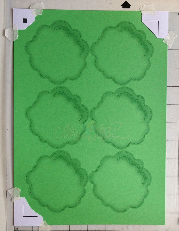 Depois de muito insistir e a Silhouette não ler as marcas impressas no verde que eu estava utilizando, recortei as marcas de registro de uma folha branca que eu havia usado em um corte anterior, posicionei por cima das marcas do papel verde e coloquei fita crepe para segurar.